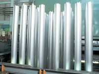 將合金鋁澆進(jìn)鑄模內(nèi)后急速冷卻,液體凝固后形成圓柱狀的鋁棒。照片中是被吊起的、長(zhǎng)達(dá)6米的鋁棒。